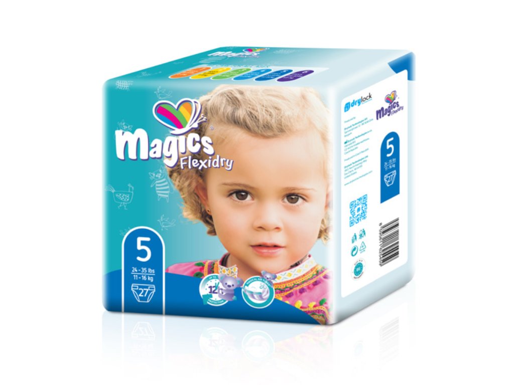Dětské pleny Magics Flexidry Junior pro malé dítě s hmotností 11–16 kg. Velmi tenké pleny s technologií Drylock, které pomáhají rychle odvádět vlhkost a udržet pokožku dítěte v suchu. Praktické balení obsahuje 27 kusů.
