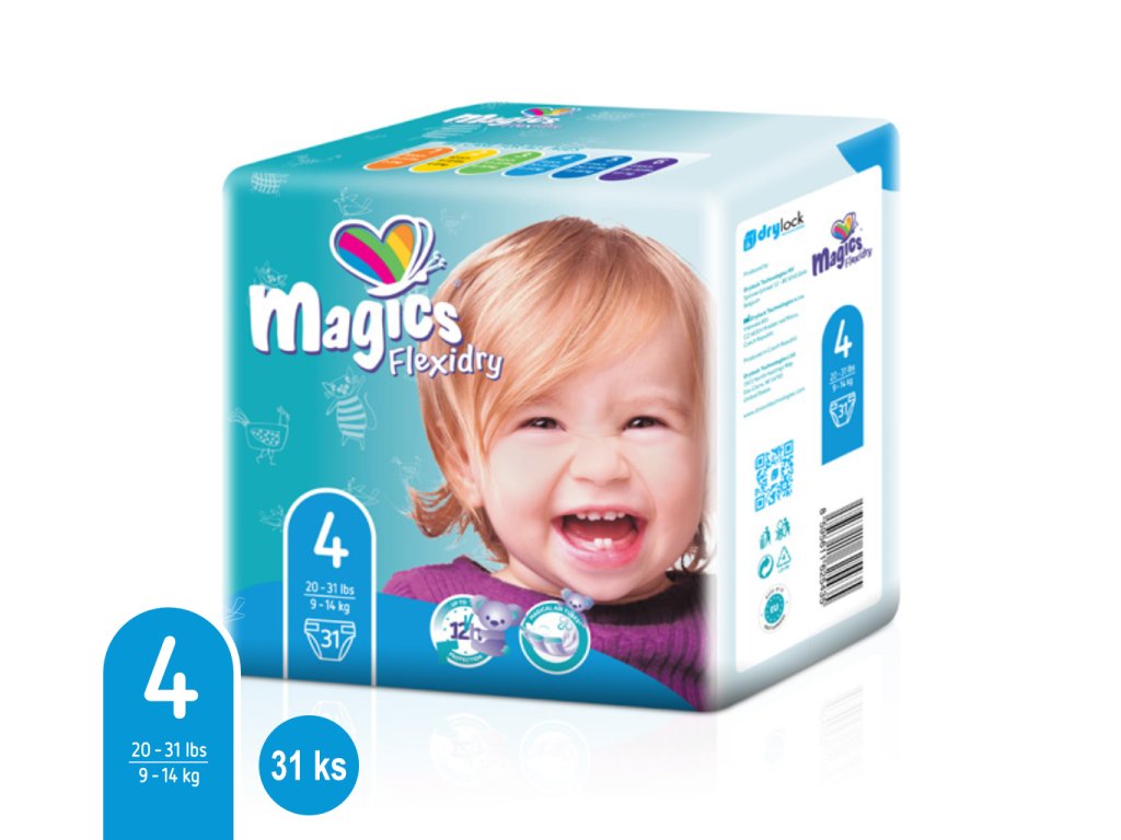 Dětské pleny Magics Flexidry Maxi pro malé dítě s hmotností 9–14 kg. Velmi tenké pleny s technologií Drylock, které pomáhají rychle odvádět vlhkost a udržet pokožku dítěte v suchu. Praktické balení obsahuje 31 kusů.